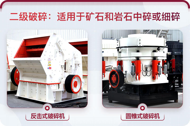 二破(圓錐破/反擊破):二破用圓錐破或反擊破都可以,只不過(guò)考慮到產(chǎn)量和成品粒型,前者更偏向于硬度較大的石料,后者適用于軟性物料。